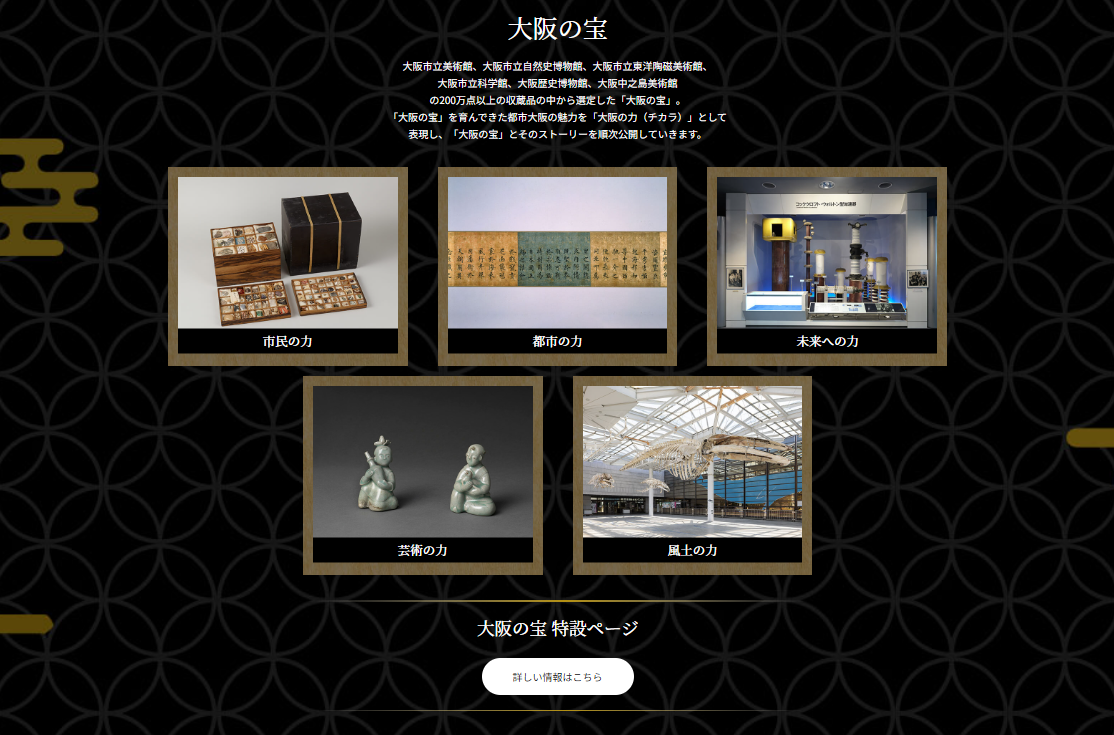また、本ウェブサイトは、2025年の大阪・関西万博に合わせて上記6館が実施する「大阪博」のウェブサイトと連携しており、「大阪博」において公開する「大阪の宝」(6館が選定した収蔵品)を紹介していきます。